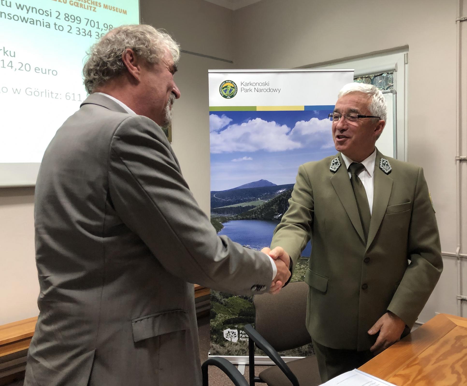 21.10.2019 roku w Sobieszowie dyrektor Karkonoskiego Parku Narodowego dr Andrzej Raj oraz dyrektor Muzeum Śląskiego w Görlitz dr Markus Bauer podpisali umowę partnerską w związku z rozpoczynającą się niebawem realizacją projektu "Śląsk – wspólne dziedzictwo przyrodnicze i kulturowe", współfinansowanego w ramach Programu Współpracy INTERREG Polska – Saksonia 2014-2020.Z tej okazji w dyrekcji KPN odbyło się oficjalne spotkanie przedstawicieli obu partnerów oraz konferencja prasowa, podczas których opowiedzieliśmy o naszych wspólnych planach i głównych działaniach przewidzianych w projekcie.