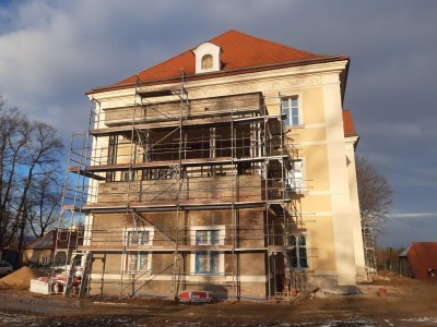Po miesiącach zdominowanych przez szary beton i tynk, w Pałacu przyszedł czas na wprowadzanie szlachetniejszych materiałów wykończeniowych i kolorów – na podłogach oraz stopniach i podstopnicach na klatce schodowej króluje piaskowiec o ciepłej delikatnej barwie. Ściany malujemy przełamaną bielą, co w połączeniu z białą stolarką okienną sprawia, że pomieszczenia stają się przestronne i jasne. Przez wszystkie kondygnacje przechodzi elegancki oszklony szyb windy. Na oszklenie czeka też aluminiowa konstrukcja fasady na werandzie. Dotarła już zamówiona wykładzina dywanowa, którą wykonawca zacznie rozkładać w pomieszczeniach I i II piętra w przyszłym tygodniu. Lada dzień uruchomiona zostanie pompa ciepła, która zacznie regularnie ogrzewać budynek. Na zewnątrz Pałac jest prawie gotowy, trwają ostatnie prace konserwatorskie przy obu portalach wejściowych.