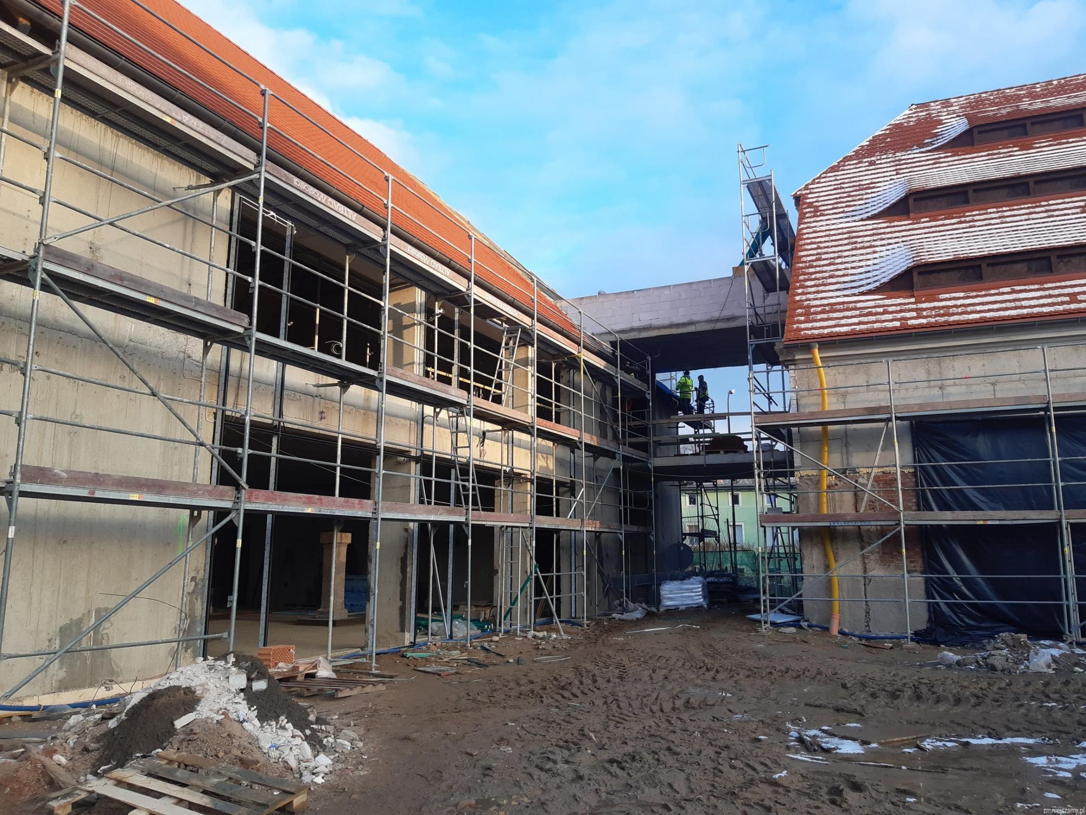 Obserwatorzy i mieszkańcy Sobieszowa na pewno zauważyli, że w oczach wyrósł nam Budynek Wejściowy – nowoczesna konstrukcja, która łączy Wielką i Małą Stajnię. W tym miejscu będziemy witać gości odwiedzających Centrum Muzealno-Edukacyjne KPN – Pałac Sobieszów. Tutaj też eksponujemy, niczym w galerii rzeźby, oryginalne granitowe podpory, które pierwotnie znajdowały się w istniejącym wcześniej w tym miejscu budynku stajennym. Na piętrze zaplanowaliśmy nowoczesne sale warsztatowe, w których nasi edukatorzy będą mogli prowadzić zajęcia dla grup. Z Budynku Wejściowego do Małej Stajni biegnie łącznik, który lada moment zostanie pokryty dachem. Na parterze Małej Stajni wzniesiono ścianki działowe w pomieszczeniach zaprojektowanego zaplecza kuchennego.Rozłożono także instalację ogrzewania podłogowego, którą niebawem przykryje posadzka.